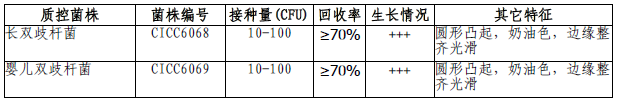 按标签用法制备培养基,接种以下质控菌株,放置36±1℃厌氧培养48小时。注:回收率计算时,用MRS琼脂做对照培养基。