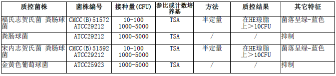 按标签用法制备培养基,接种以下质控菌株,放置36±1℃需氧培养18-24小时。