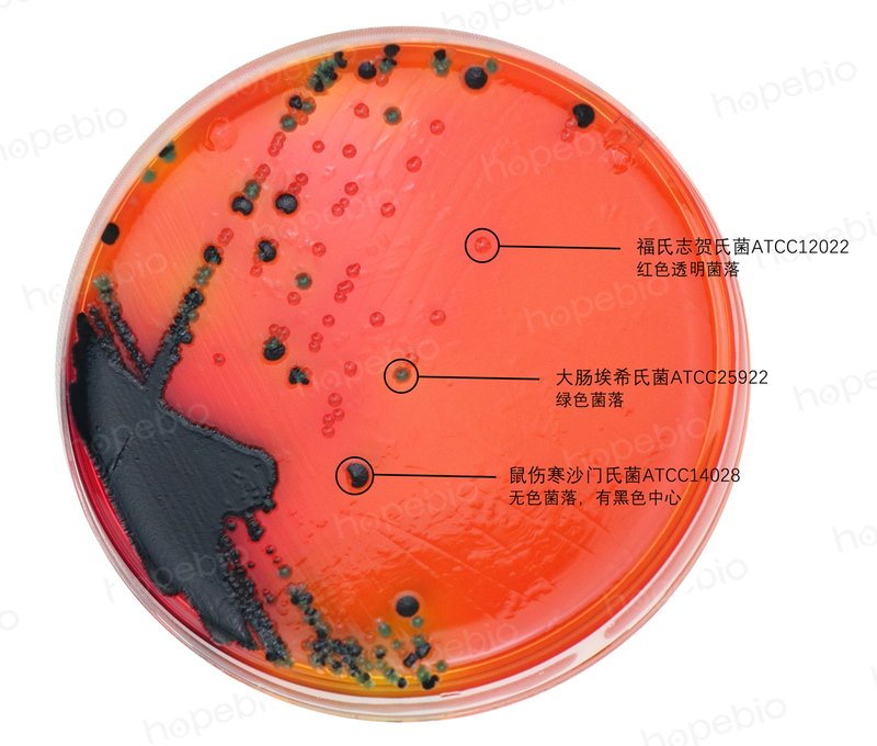 志贺氏菌显白色或无色,有些宋内氏志贺氏菌有蓝色中心;大肠杆菌和大肠菌群显绿色或黄色;沙门氏菌显黄色或无色并有黑色中心;其它细菌显蓝绿色或黄色。变形杆菌和铜绿假单胞菌基本不生长。