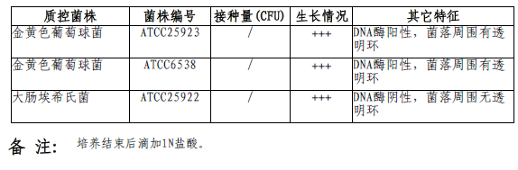 称取本品42.0g,缓缓加热溶解于1000ml蒸馏水中(避免形成不溶性丝状物),116℃高压灭菌15分钟,冷至50℃左右时,倾入无菌平皿。将平板培养基分成4-8区,每区用接种环划线肉汤培养物,37℃培养18-24小时,在培养基表面滴加 1mol/L盐酸,若为DNA酶阳性,在生长菌落周围产生明显透明环。如果加入0.1%甲苯胺蓝溶液,残留DNA部分变蓝,其水解部分变为蔷薇色。
