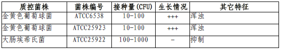 按标签用法制备培养基,接种以下质控菌株,放置36±1℃需氧培养18-24小时。