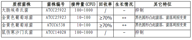 按标签用法制备培养基,接种以下质控菌株,放置36±1℃需氧培养24-48小时。 注:回收率计算时,用TSA琼脂做对照培养基。