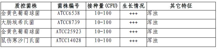 接种10-100个金黄色葡萄球菌,大肠杆菌、沙门氏菌,在36±1℃培养18-24小时生长明显,溶液混浊。