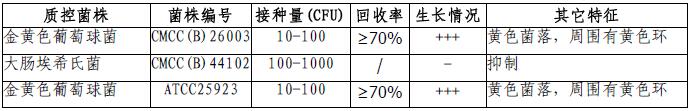 按标签用法制备培养基,接种以下质控菌株,放置30-35℃需氧培养18-72小时。注:回收率计算时,用TSA琼脂做对照培养基。