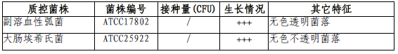 按标签用法制备培养基,接种以下质控菌株,放置37±1℃需氧培养24±3小时。