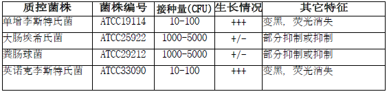 按标签用法制备培养基,接种以下质控菌株,放置36±1℃需氧培养48±2小时。