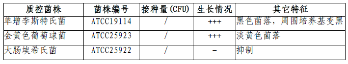 按标签用法制备培养基,接种以下质控菌株,放置36±1℃需氧培养24-48小时。