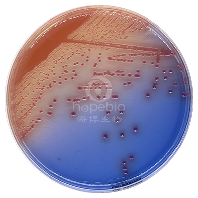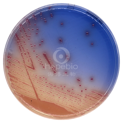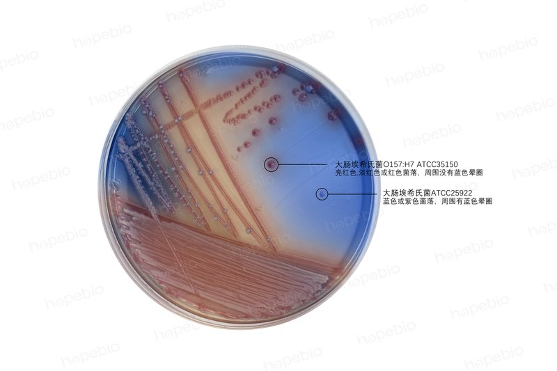 大肠杆菌O157:H7显色培养基是青岛海博生物公司改良的培养基,用于食品、病人粪便样品中O157:H7菌的快速检测。O157:H7菌显亮红色、淡红色或红色,菌落周围没有蓝色晕圈,大肠杆菌和大肠菌群显暗蓝色、蓝色或紫色,菌落周围有蓝色晕圈;其它细菌显蓝色、黄色或无色。本培养基的特异性高,可以克服SMAC培养基引起的假阳性和假阴性结果,是一种很理想的快速检测培养基。