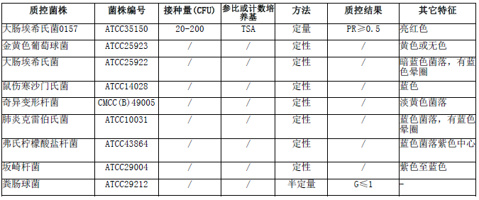 按标签用法制备培养基,接种以下质控菌株,放置36±1℃需氧培养18-24小时。