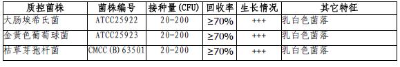 按标签用法制备培养基,接种以下质控菌株,放置36±1℃需氧培养18-24小时。注:回收率计算时,用TSA琼脂做对照培养基。