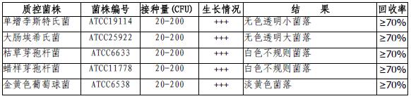 接种以下质控菌株,放置36±1℃需氧培养48±2小时。 注:回收率计算时,用TSA琼脂做对照培养基。