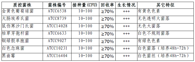 按标签用法制备培养基,接种以下质控菌株,放置30-35℃需氧培养18-24小时。 注:回收率计算时,用TSA琼脂做对照培养基。