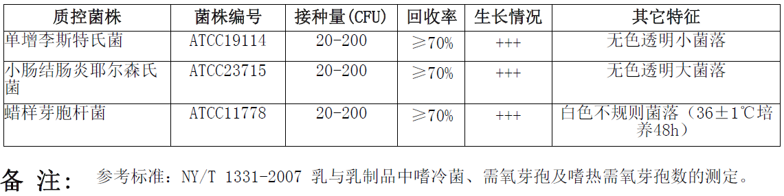 MPC琼脂培养基微生物灵敏度试验:按标签用法制备培养基,接种以下质控菌株,放置6.5±0.5℃需氧培养10天。注:回收率计算时,用TSA琼脂做对照培养基。