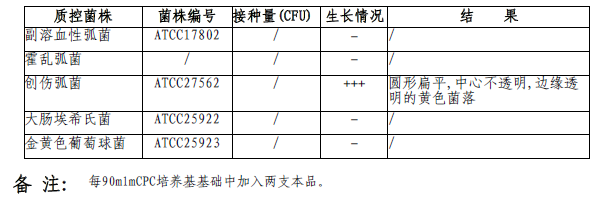按标签用法制备培养基,接种以下质控菌株,放置36±1℃需氧培养18-24小时。