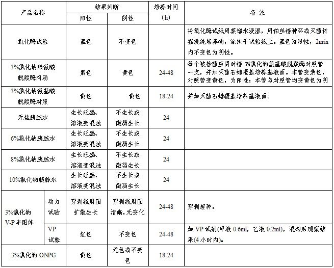 用于创伤弧菌的生化鉴定,每条组成:无盐胰胨水,6%氯化钠胰胨水,8%氯化钠胰胨水,10%氯化钠胰胨水,3%氯化钠VP半固体培养基,3%氯化钠赖氨酸脱羧酶,3%氯化钠氨基酸脱羧酶对照,3%氯化钠ONPG,氧化酶试纸1包,共9种生化反应。(GB标准)