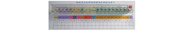 取一内盛2ml无菌水或无菌生理盐水试管,用接种针从营养琼脂斜面挑取部分菌落至无菌水中仔细研磨制成0.5麦氏浊度的均一细菌悬液,每孔加入100ul菌悬液,其中固体和半固体生化管采用穿剌接种。赖氨酸、鸟氨酸和氨基酸对照需加灭菌石蜡覆盖液面。