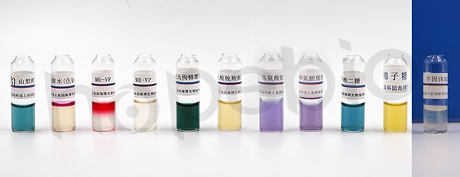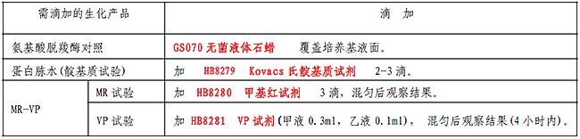 山梨醇发酵管1支、色氨酸肉汤(蛋白胨水)1支、MR-VP 2支、氧化酶试纸1片、西蒙氏柠檬酸盐1支、鸟氨酸1支、赖氨酸1支、氨基酸脱羧酶对照1支、纤维二糖1支、棉子糖1支、动力试验1支、共11种生化鉴定管并含无菌液体石蜡1支。