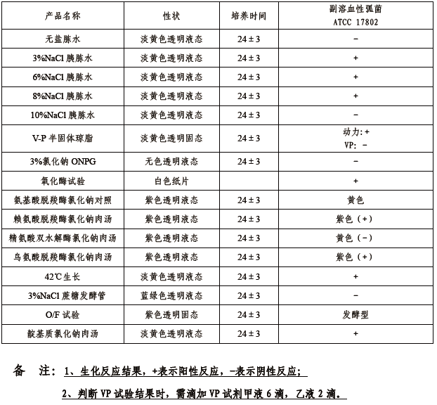 用于副溶血性弧菌的生化鉴定,每条包括:无盐胨水、3%NaCl胰胨水、7%NaCl胰胨水、10%NaCl胰胨水、3%NaClVP半固体、赖氨酸脱羧酶、精氨脱羧酶、氨基酸脱羧酶对照、O/F试验(2孔)、蔗糖发酵管、42℃生长共12种生化反应。(SN标准)