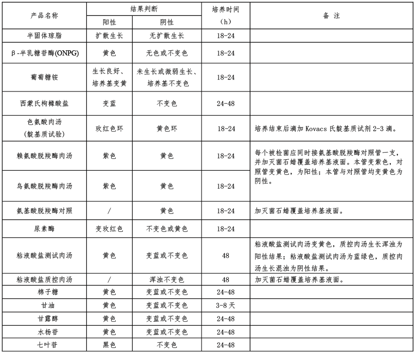 取一内盛2ml无菌水或无菌生理盐水试管,用接种针从营养琼脂斜面挑取部分菌落至无菌水中仔细研磨制成0.5麦氏浊度的均一细菌悬液(约109CFU/mL),每孔加入100ul菌悬液,其中固体和半固体生化管采用穿剌接种。赖氨酸、鸟氨酸和氨基酸对照需加灭菌石蜡覆盖液面。
