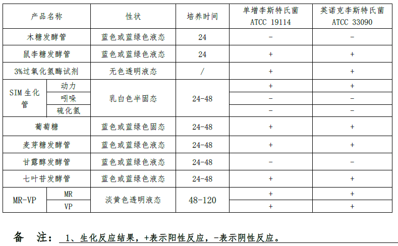 用于单增李斯特氏菌的生化鉴定组成:木糖发酵管、鼠李糖发酵管、SIM生化管、3%过氧化氢酶试剂、葡萄糖、麦芽糖发酵管、甘露醇发酵管、七叶苷发酵管、MR-VP(2孔),共10种生化反应。(GB标准)