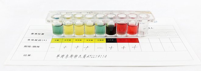 从包装盒中取出一条生化鉴定条,打开盖子,用打孔器开孔或直接把膜撕掉。如果染菌或变色,则不能使用,重新拿一条。注:打孔器用75%酒精擦拭后使用。