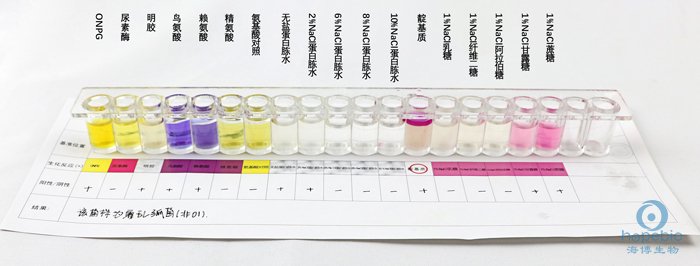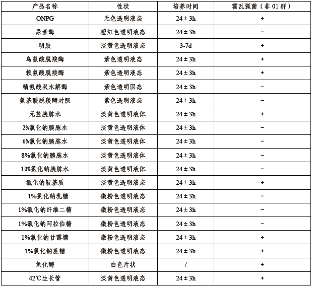 用于霍乱弧菌的生化鉴定。组成:MR-VP、ONPG、尿素酶、明胶、精氨酸双水解酶肉汤、鸟氨酸脱羧酶肉汤、赖氨酸脱羧酶肉汤、氨基酸脱羧酶对照、无盐胰胨水、3%氯化钠胰胨水、6%氯化钠胰胨水、8%氯化钠胰胨水、10%氯化钠胰胨水、1%氯化钠甘露醇、1%氯化钠乳糖、1%氯化钠纤维二糖、1%氯化钠阿拉伯糖、1%氯化钠蔗糖、1%氯化钠甘露糖、42℃生长试验,共20种生化反应。(SN标准)