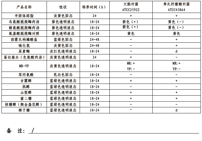 用于肠杆菌科细菌的生化鉴定,包括半固体琼脂,鸟氨酸脱羧酶肉汤,赖氨酸脱羧酶肉汤,氨基酸脱羧酶对照,西蒙氏枸橼酸盐,硫化氢,蛋白胨水(色氨酸肉汤),MR-VP(2孔),苯丙氨酸,甘露醇,肌醇,山梨醇,蜜二糖,核糖醇(侧金盏花醇),棉子糖共16种生化反应。(GB标准)