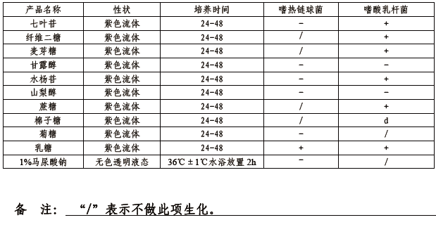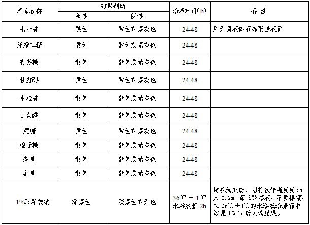 挑取纯化培养物,制成菌悬液,分别接种到以下培养基:七叶苷、纤维二糖、麦芽糖、甘露醇、麦芽糖、水杨苷、山梨醇、蔗糖、棉子糖、菊糖、乳糖、1%马尿酸钠。