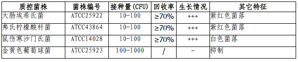按标签用法制备培养基,接种以下质控菌株,放置36±1℃需氧培养18-24小时。 注:回收率计算时,用TSA琼脂做对照培养基。