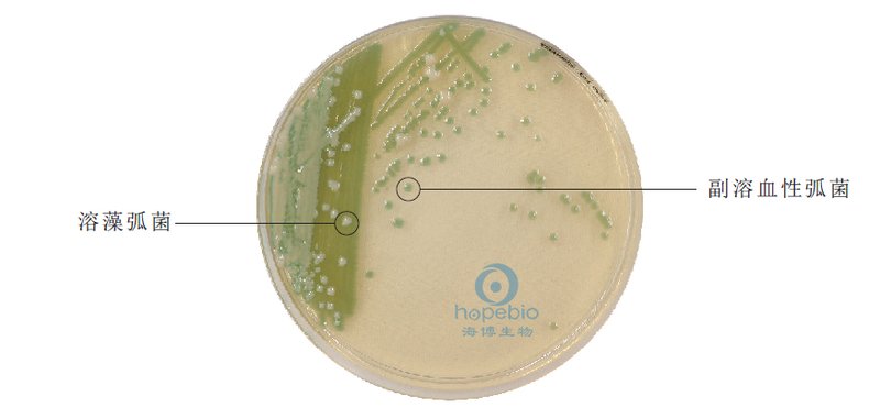 弧菌显色培养基是青岛海博生物公司改良的培养基,用于食品、海产品、病人粪便样品和水产品中副溶血性弧菌的快速检测。副溶血性弧菌显蓝绿色且菌落比较大,霍乱弧菌和创伤弧菌显紫红色,溶藻弧菌显淡黄色或米黄色;其它细菌绝大部分被抑制。本培养基的特异性高,可以克服TCBS培养基引起的假阴性结果,是一种很理想的快速检测培养基。成份(g/L)