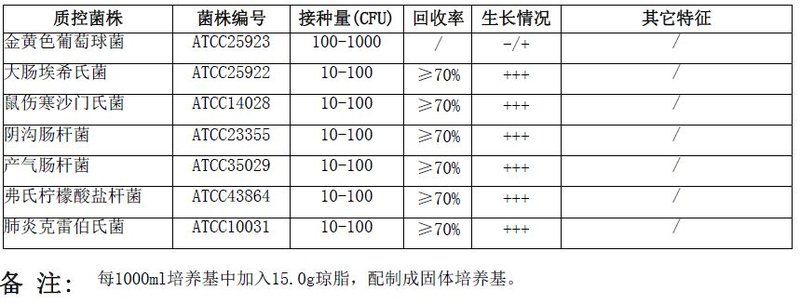 大肠杆菌/大肠菌群液体显色培养基微生物灵敏度试验: 按标签用法制备培养基,接种以下质控菌株,放置36±1℃需氧培养18-24小时。 注:回收率计算时,用TSA琼脂做对照培养基。