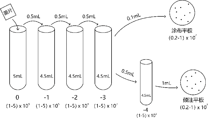 用无菌镊子取一片菌片,投入到5mL无菌生理盐水管中,用电动混匀器振荡混匀20秒,将菌洗下形成菌悬液,计为0管。从0管吸取500μL菌液至4.5mL无菌生理盐水管中,用电动混匀器振荡混匀20秒,得到-1管,从-1管吸取500μL菌液至4.5mL无菌生理盐水管中,用电动混匀器振荡荡混匀20秒,得到-2管。从-2管吸取500μL菌液至4.5mL无菌生理盐水管中,用电动混匀器震荡混合20秒,得到-3管。从-3管中吸取100μL菌液涂布TSA后培养计数。(如果采用倾注法计数应进一步稀释至-4梯度管,然后吸取1mL菌液至无菌平皿内,取40-45℃TSA培养基倾注平板,每平皿倾注15-20mL,充分混匀自然凝固后培养计数。)平板菌落数在20-100CFU,则说明原0管中洗脱下来的菌量在(1-5)*106CFU,即每片菌片有效回收菌量在(1-5)*106CFU/片。详细操作步骤见下图: