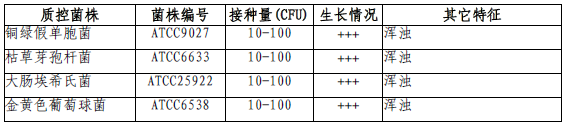 按标签用法制备培养基,接种以下质控菌株,放置30-35℃需氧培养48-120小时。