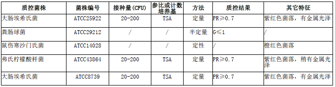 按标签用法制备培养基,接种以下质控菌株,放置36±1℃需氧培养24±2小时。