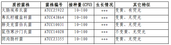 按标签用法制备培养基,接种以下质控菌株,放置36±1℃需氧培养24小时。