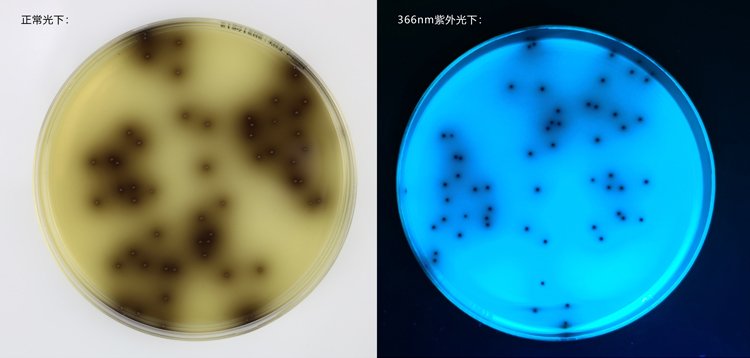 粪肠球菌ATCC29212在胆汁七叶苷琼脂上为棕黑色菌落,366nm紫外灯下菌落周围荧光消失