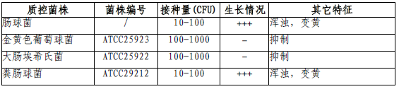 按标签用法制备培养基,接种以下质控菌株,放置36±1℃需氧培养48±2小时。