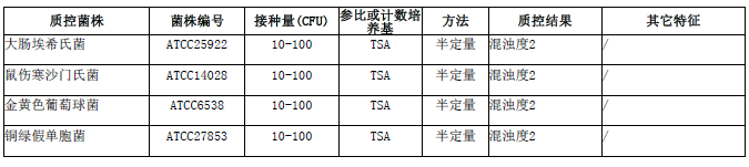 按标签用法制备培养基,接种以下质控菌株,放置36±1℃需氧培养18-24小时。