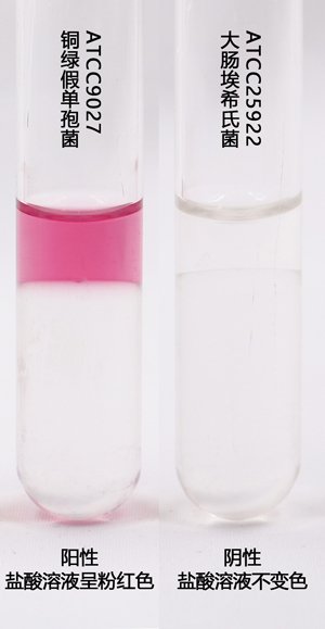 方法:挑取可疑菌落接种在在绿脓菌素测定用培养基(PDP)斜面上,培养24小时,观察斜面有无色素。如有色素,在试管内加氯仿3.0~5.0mL,充分震摇,使培养物中的绿脓菌素提取在氯仿中,待氯仿提取液呈现绿色时,加1mol/L盐酸约1mL,震摇后静置片刻,上层盐酸溶液中呈现粉红至红色实验结果为阳性,否则为阴性。