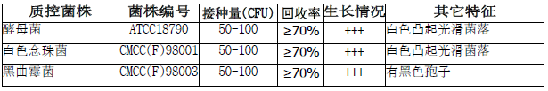 按标签用法制备培养基,接种以下质控菌株,放置23-28℃需氧培养48-72小时。 注:回收率计算时,用SDA琼脂做对照培养基。
