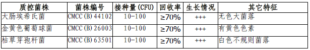 按标签用法制备培养基,接种以下质控菌株,放置30-35℃需氧培养18-24小时。 注:回收率计算时,用TSA琼脂做对照培养基。