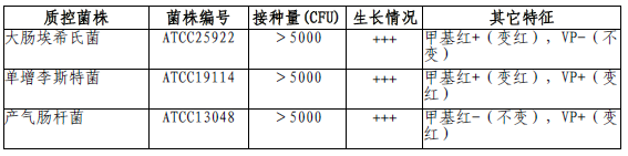 按标签用法制备培养基,接种以下质控菌株,放置36±1℃需氧培养24-48小时。