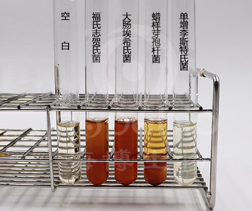 在硝酸盐肉汤中,福氏志贺氏菌、大肠埃希氏菌、蜡样芽胞杆菌生长,溶液变红色,单增李斯特氏菌生长,溶液不变红色,仍为黄色。