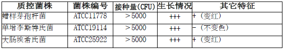按标签用法制备培养基,接种以下质控菌株,放置36±1℃需氧培养18-24小时。