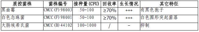 按标签用法制备培养基,接种以下质控菌株,放置20-25℃需氧培养48-72小时。注:回收率计算时,用SDA琼脂做对照培养基。
