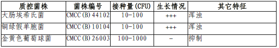 按标签用法制备培养基,接种以下质控菌株, 放置30-35℃需氧培养24-48小时。