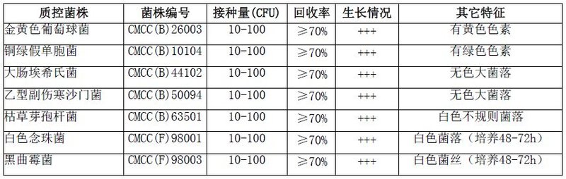 按标签用法制备培养基,接种以下质控菌株,放置30-35℃需氧培养18-24小时。 注:回收率计算时,用TSA琼脂做对照培养基。
