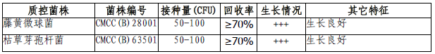 按标签用法制备培养基,接种以下质控菌株,放置36±1℃需氧培养16-18小时。 注:回收率计算时,用TSA琼脂做对照培养基。