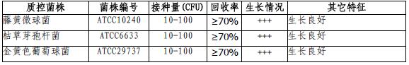 按标签用法制备培养基,接种以下质控菌株,放置32-35℃需氧培养24小时。注:回收率计算时,用TSA琼脂做对照培养基。