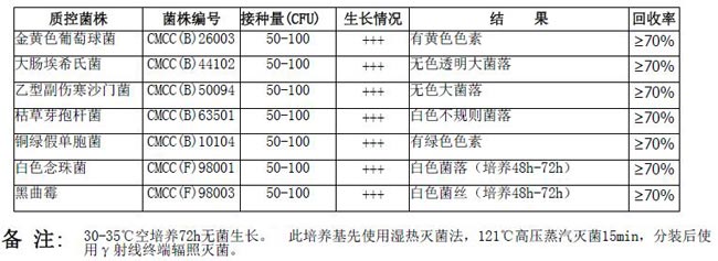 接种以下质控菌株,放置30-35℃需氧培养18-24小时。 注:回收率计算时,用TSA琼脂做对照培养基。